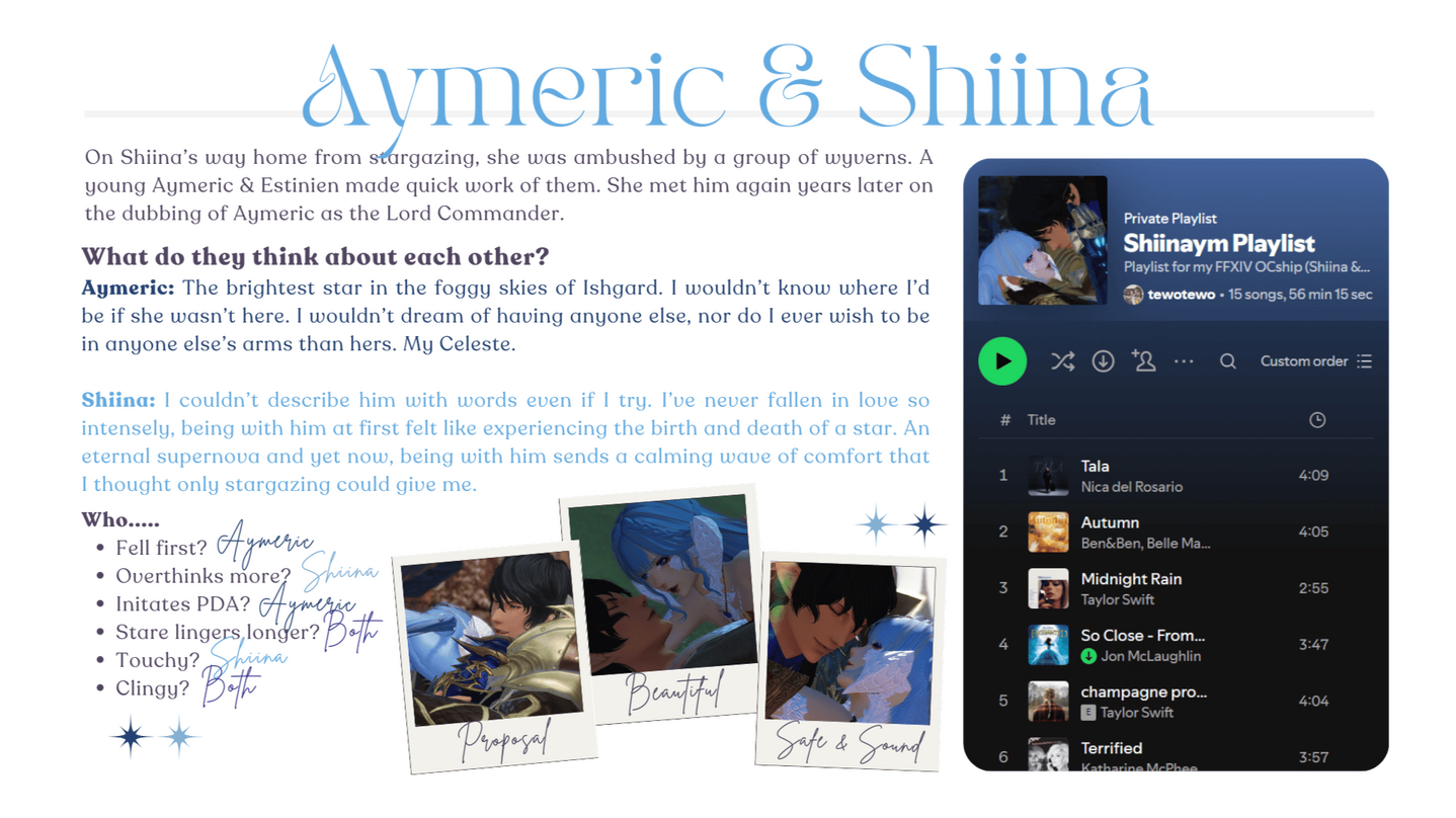 She became friends with many knights & lords patrolling in that area. She met a young Artoriel who she bonded over with songwriting and to an extent, a young Haurchefant who quickly became a younger brother to her as she watched him grow into the Knight Commander of Camp Dragonhead.She also has met a Estinien and Aymeric who were around 22 around this time as well. The two promising knights saved her from wyverns that terrorised her on her way back from stargazing at the Coerthas Central Highlands.When she turned 30, she witnessed Aymeric’s ceremony in becoming the Lord Commander at the age of 25.The young lord commander, after his own ceremony, confessed his feelings for Shiina, whom she rejected at the time, telling him to focus on his new role as the lord commander.Despite this, Aymeric would still visit her at the Athenaeum Astrologicum and pass it off as patrolling at the time.When Shiina was 32, the Calamity struck all of Eorzea. Some areas not as affected as others but Ishgard was enveloped into a white sheet of a forever winter.During this time, Shiina saw less and less of her friends as they all became busy trying to manage this cold. The supplies and food dwindled and they had to prioritize trading, changing the whole economy of the nation.