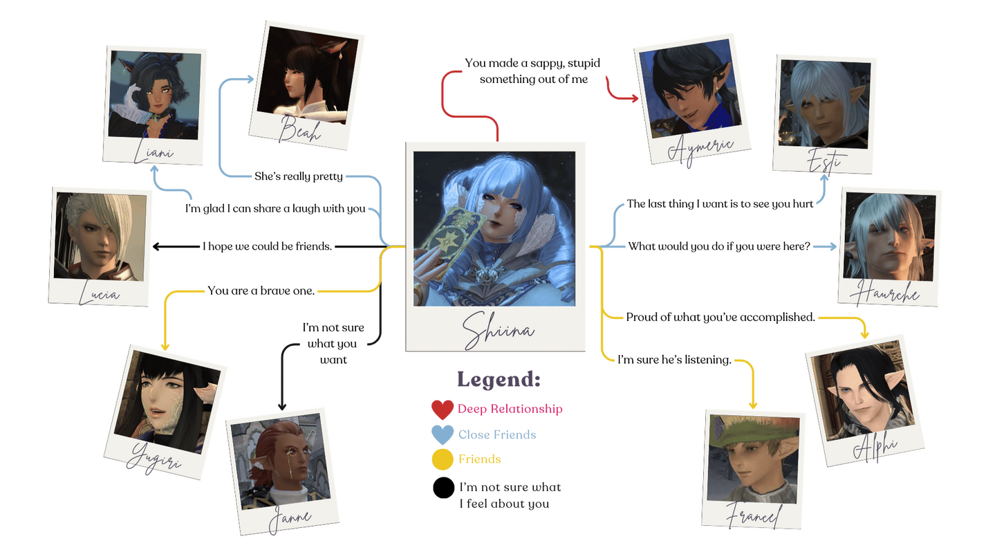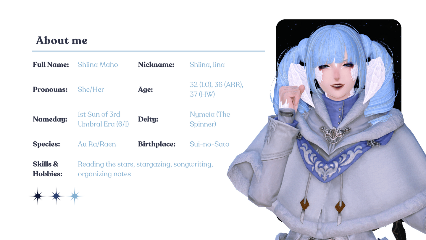 She became friends with many knights & lords patrolling in that area. She met a young Artoriel who she bonded over with songwriting and to an extent, a young Haurchefant who quickly became a younger brother to her as she watched him grow into the Knight Commander of Camp Dragonhead.She also has met a Estinien and Aymeric who were around 22 around this time as well. The two promising knights saved her from wyverns that terrorised her on her way back from stargazing at the Coerthas Central Highlands.When she turned 30, she witnessed Aymeric’s ceremony in becoming the Lord Commander at the age of 25.The young lord commander, after his own ceremony, confessed his feelings for Shiina, whom she rejected at the time, telling him to focus on his new role as the lord commander.Despite this, Aymeric would still visit her at the Athenaeum Astrologicum and pass it off as patrolling at the time.When Shiina was 32, the Calamity struck all of Eorzea. Some areas not as affected as others but Ishgard was enveloped into a white sheet of a forever winter.During this time, Shiina saw less and less of her friends as they all became busy trying to manage this cold. The supplies and food dwindled and they had to prioritize trading, changing the whole economy of the nation.