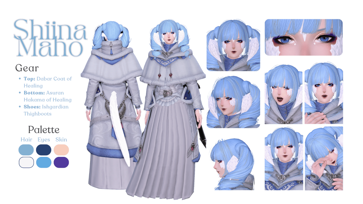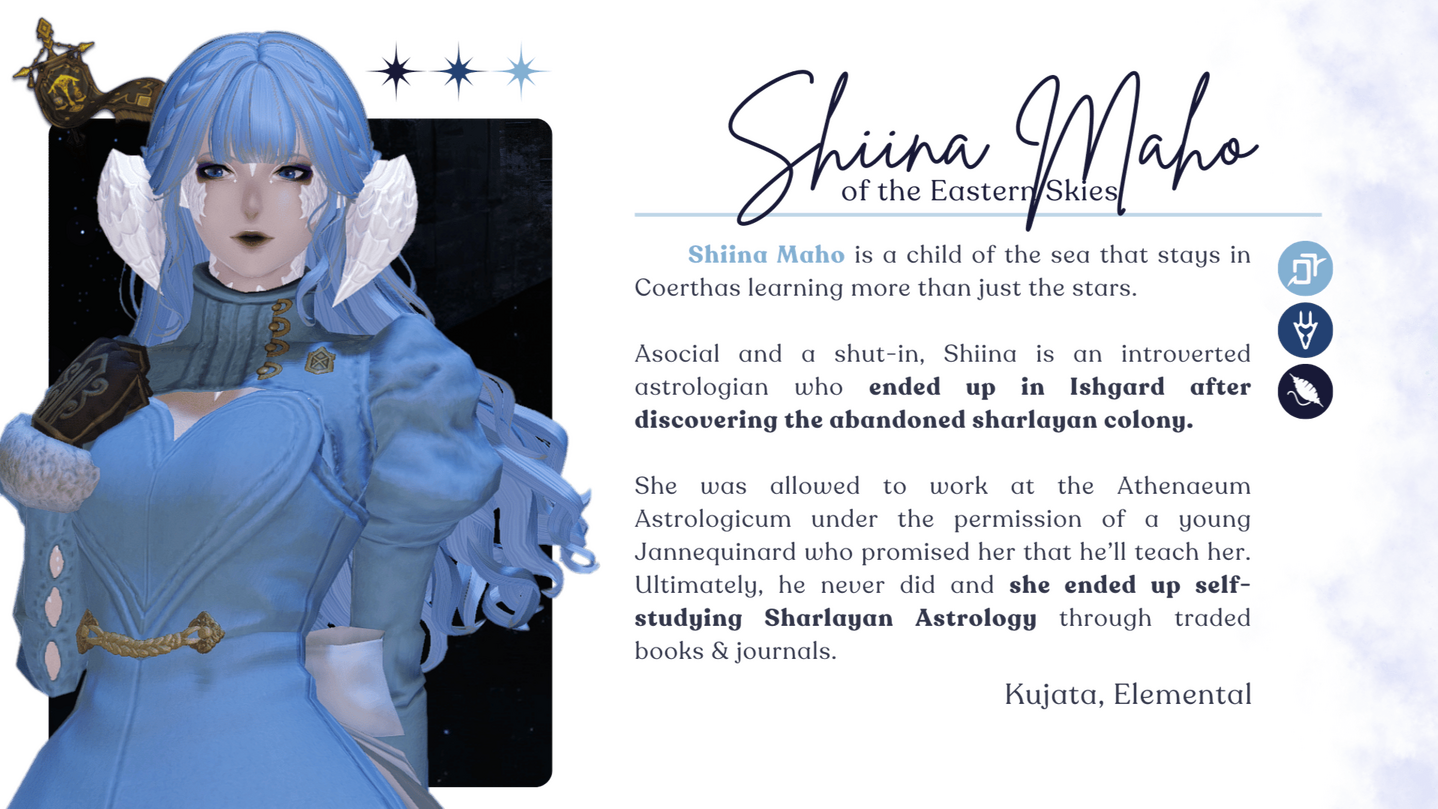 News from Kojin came out that Doma was under the garlean empire’s occupation. Shiina was 12 years old when they learned of this and so, she was forbidden to watch the stars in clear skies in fear that the garleans would figure out their peaceful settlement.When she turned 22, 10 years under the occupation of the garlean empire in Doma, she decided to take a risk. She misses the stars deeply and wishes to see them once more. So, she readied herself to embark on an adventure to learn sharlayan astrology, and made sure that her family was safe before packing up. She, however, was caught by her father who reprimanded her at first but ultimately let her go, knowing that he couldn’t separate her from the stars.She had her eyes set on Sharlayan due to hearing stories about Astrologians and the study of stars from her Kojin friends. With the help of these friends and her studious mindset, she successfully sailed to Eorzea.Upon her arrival to Coerthas, she was met with distaste by Ishgardians. It seems that years ago, Au Ri were thought to be connected to Draconian roots and so slaughtered many of her kind.She did reach Dravania at one point, but was soon to find out that the Sharlayan camp was empty.